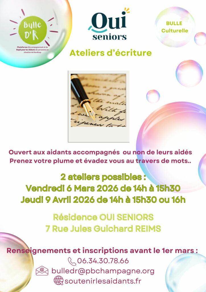 La plateforme Bulle d’R s’est associée à la résidence « OUI sénior : Les Girardières », pour vous inviter à participer à nos ateliers écriture, conçus pour vous évader, aller à la rencontre de votre imaginaire, ou exprimer des pensées du quotidien, dans une ambiance conviviale.