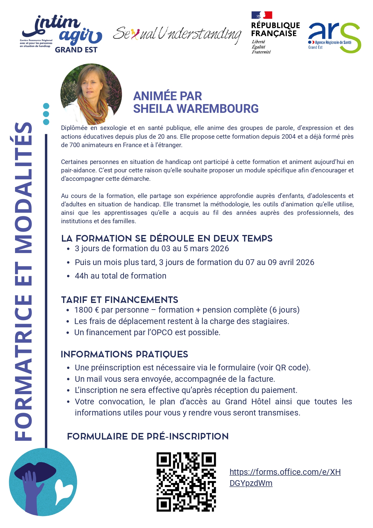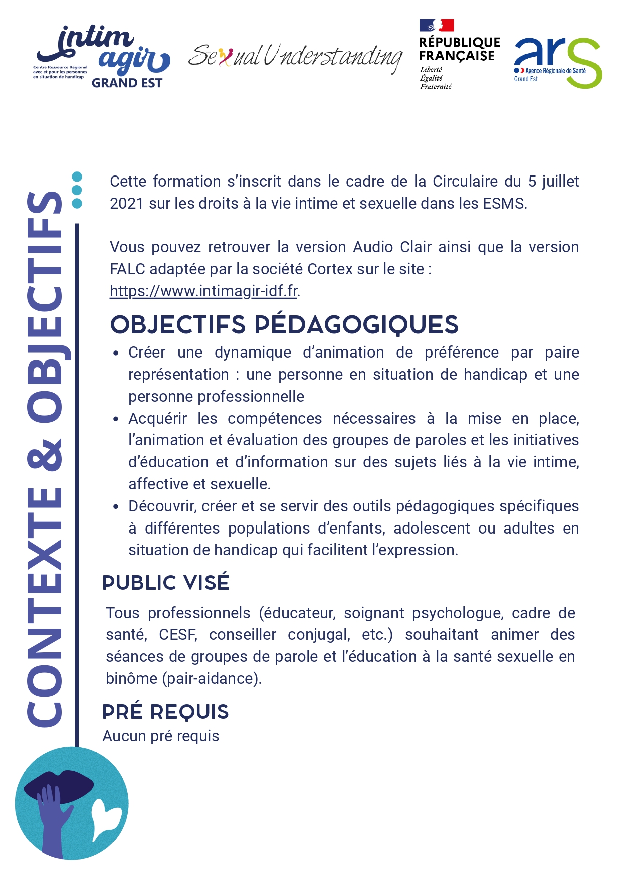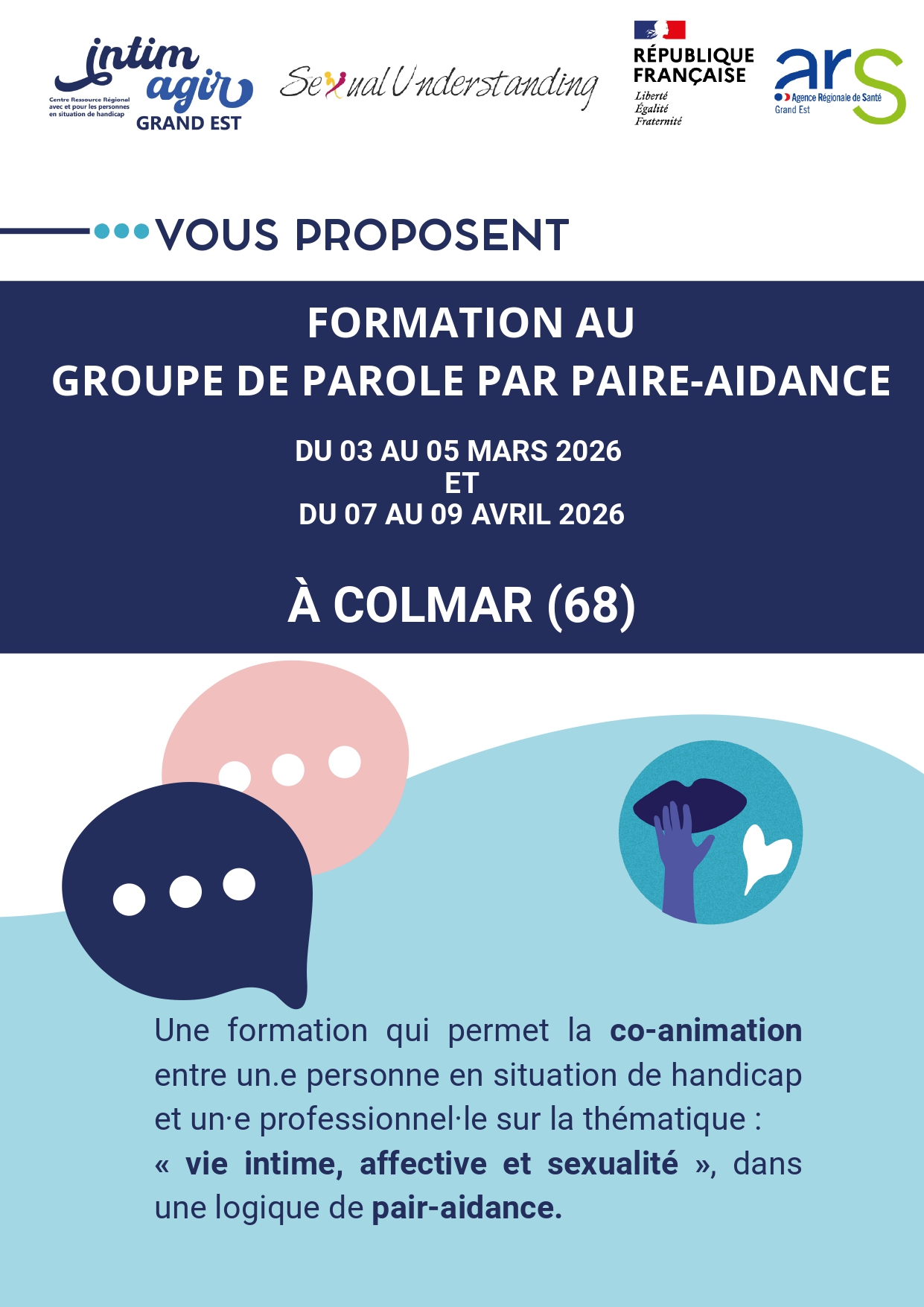 Le Centre de Ressource Intim’Agir Grand Est, en collaboration avec Sexual Understanding, propose une formation qui permet la co-animation entre une personne en situation de handicap et un professionnel de groupes de parole sur la thématique : « vie intime, affective et sexualité », dans une logique de paire-aidance.