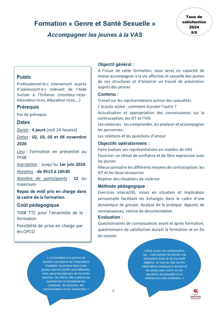 Le Planning Familial 68 vous présente ses formations pour l’année 2026, un ensemble d’actions pensées pour accompagner les professionnel.le.s du médico-social, de l’éducation et du secteur socio-éducatif dans leurs pratiques. Fidèle à ses valeurs d’éducation populaire, l’association propose un parcours formatif ancré dans la réalité du terrain, favorisant la réflexion, l’analyse et l’évolution des représentations autour des enjeux de santé sexuelle, d’égalité, de prévention des violences et d’accompagnement des publics.