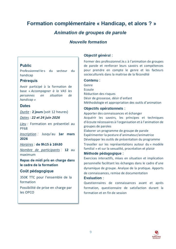 Le Planning Familial 68 vous présente ses formations pour l’année 2026, un ensemble d’actions pensées pour accompagner les professionnel.le.s du médico-social, de l’éducation et du secteur socio-éducatif dans leurs pratiques. Fidèle à ses valeurs d’éducation populaire, l’association propose un parcours formatif ancré dans la réalité du terrain, favorisant la réflexion, l’analyse et l’évolution des représentations autour des enjeux de santé sexuelle, d’égalité, de prévention des violences et d’accompagnement des publics.