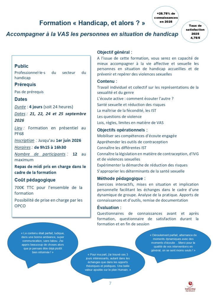 Le Planning Familial 68 vous présente ses formations pour l’année 2026, un ensemble d’actions pensées pour accompagner les professionnel.le.s du médico-social, de l’éducation et du secteur socio-éducatif dans leurs pratiques. Fidèle à ses valeurs d’éducation populaire, l’association propose un parcours formatif ancré dans la réalité du terrain, favorisant la réflexion, l’analyse et l’évolution des représentations autour des enjeux de santé sexuelle, d’égalité, de prévention des violences et d’accompagnement des publics.