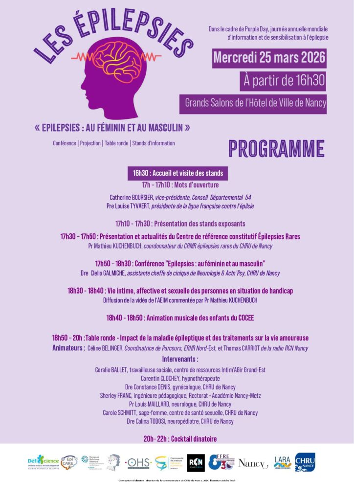 A l’occasion du Purple Day, journée annuelle internationale d’information et de sensibilisation à l’épilepsie, le Centre de Référence constitutif Epilepsies Rares du CHRU de Nancy (Dr Mathieu KUCHENBUCH / Pr Louis MAILLARD), en lien avec la plateforme Lorraine Affections Rares (LARA) et ses partenaires, organise une soirée d’échanges le